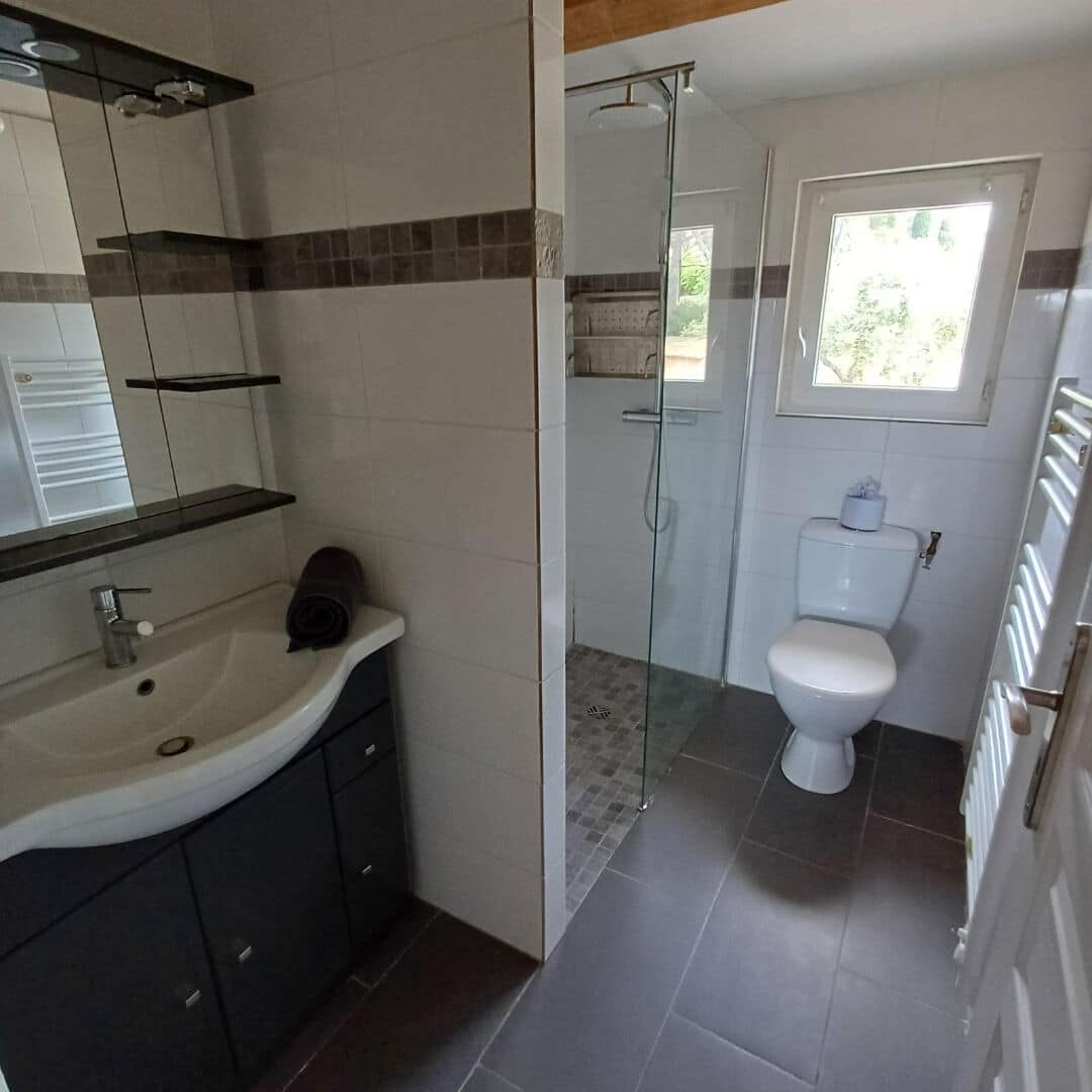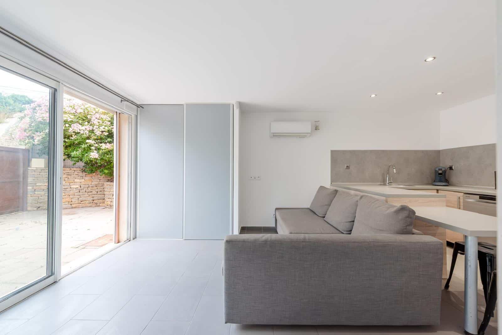 La partie haute dispose également d’un extérieur avec piscine, un véritable atout pour profiter du climat méditerranéen et très recherché pour la location saisonnière.
